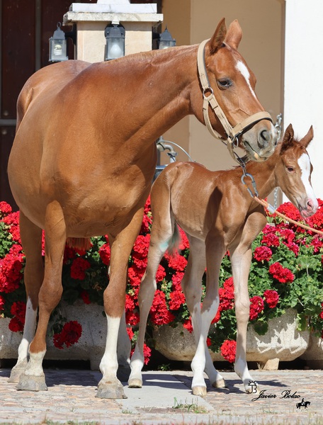 Su línea materna es de gran peso: Cartuja JB, con sangre de Zingar, Abakan (SU) y Balaton (RU), así como genética nacional destacada con Imbabura 50%, Gabacho, Garbo y Urano II.